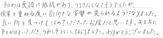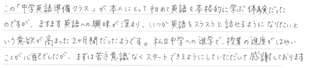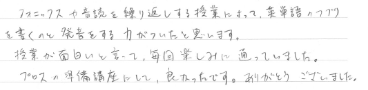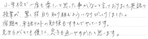 プロスの英語のテキストがとても分かりやすく、理解しやすかったです。「英語が書けるようになってきたね~」などとたくさん声を掛けてくれたことも嬉しかったし、プロスの授業がいつも楽しみでした。プロスに入るまでは英語が全くできず、中学の英語の授業についていけるかとても不安だったけれど、今は安心して中学の英語に挑めそうです。