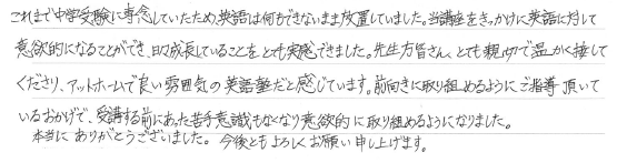一つ一つの授業がとても大切だという事が分かりました。なぜなら毎回新しい事を学んでいくからです。先生が面白く、一人一人丁寧に教えてくれました。宿題チェックなどもとても丁寧でした。毎回新しい事を学び、授業を終えるたびに英語のレベルがどんどん上がっているように感じました。学んできた知識をもっと広げ、もっと学んで英検などに挑んでみたいです。
