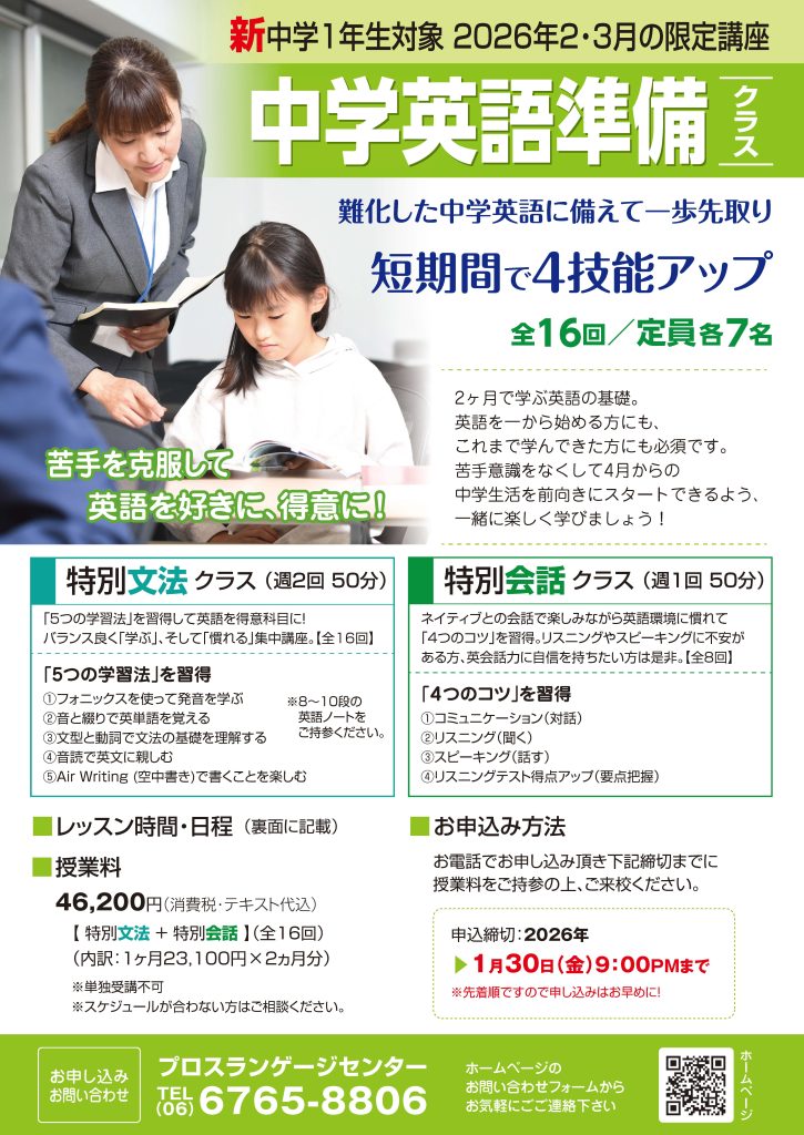 プロスでは毎年2-3月に小学6年生対象の『中学英語準備クラス』を開講しています。